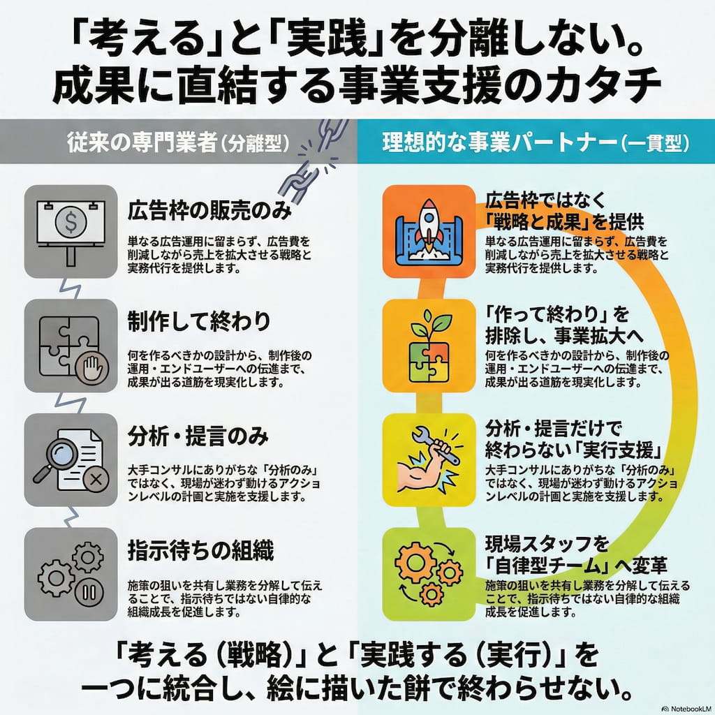 弊社は「考える」と「実践する」を分離せず、売上拡大のための戦略立案から実行支援まで一貫して行います。広告代理店は広告枠販売が中心で受け皿づくりが弱く、制作会社は「作って終わり」、大手コンサルは提言のみで実行は別となりがちです。弊社は戦略から戦術、業務代行まで総合的に支援し、月1〜3回のミーティングとチャットで常時コミュニケーションを取りながら、実働チームが自律的に動ける環境づくりまでサポートします。