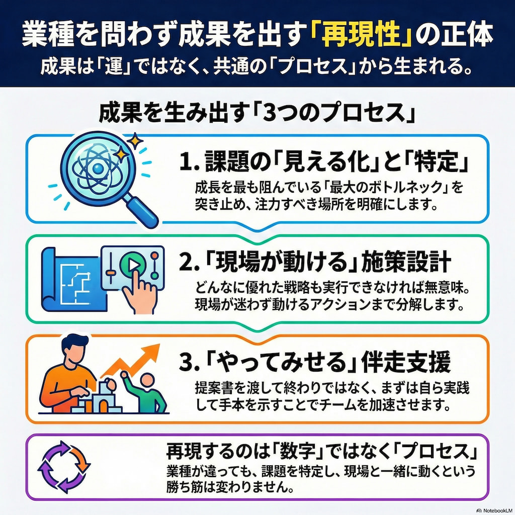 でも「課題を特定し、実行可能な形に落とし込み、現場と一緒に動く」というプロセスは同じ。再現しているのは「数字」ではなく「成果を生み出す進め方」そのものです。