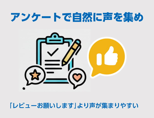 一方「アンケートへのご協力をお願いします!」は、一般的でオペレーション的にも定着しやすく、結果的にレビューが継続的に増えやすくなります。