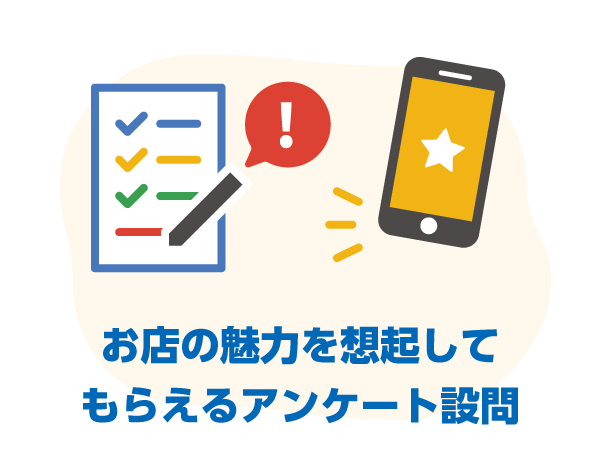 「レビューって何を書けば?考えるのがメンドウ…」というのがお客様の正直な気持ち。。。そこで、自然とお店の魅力に着目する質問を設定!結果的に、お店への印象がポジティブになりやすく、高評価レビューを引き出しやすくなります。